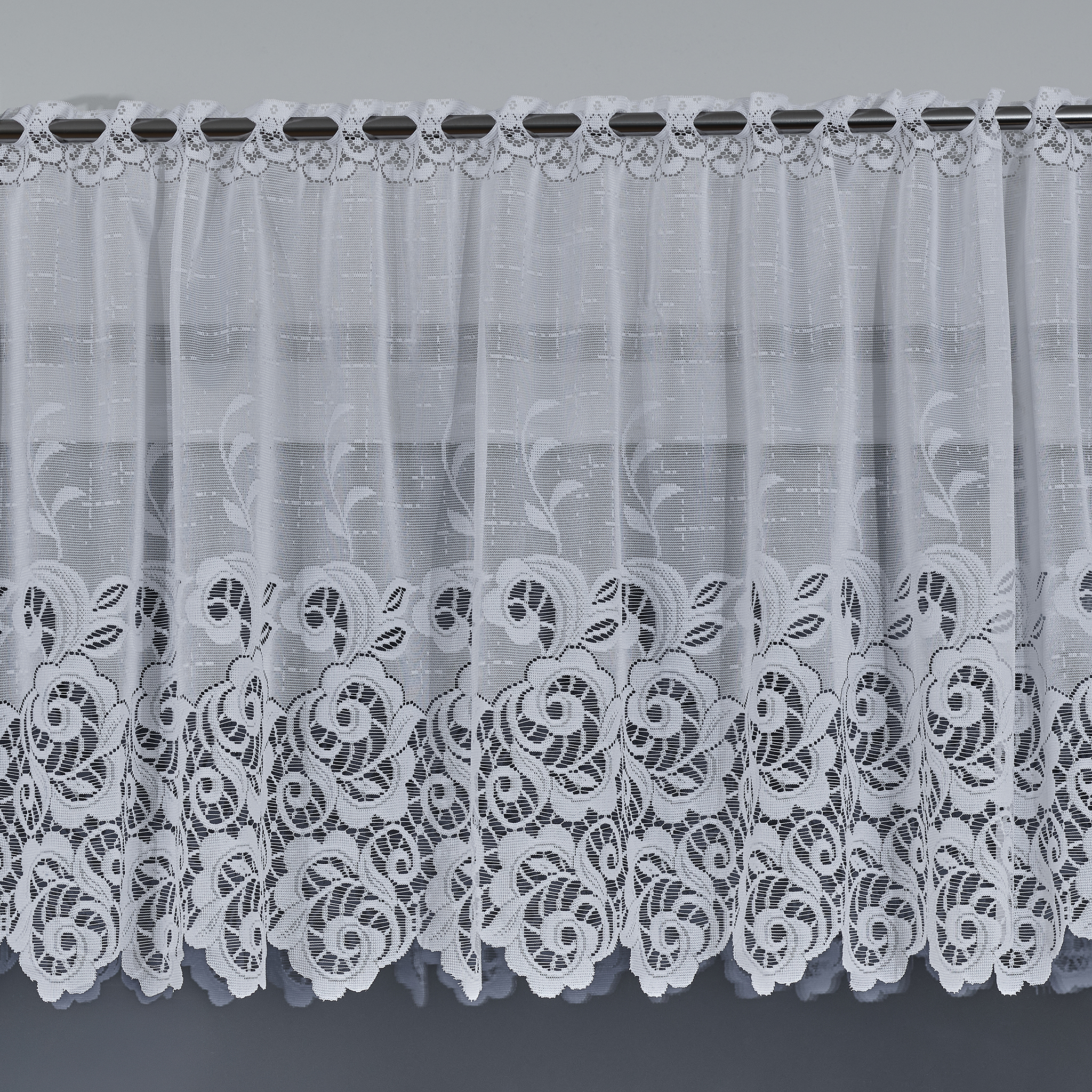 Bordura albă din poliester 100%, cu model floral elegant și orificii pentru galerie, ideală pentru decorarea ferestrelor sau personalizarea perdelelor. Cu o înălțime de 60 cm, este perfectă pentru un decor rafinat. Nu se șifonează și nu necesită călcare.